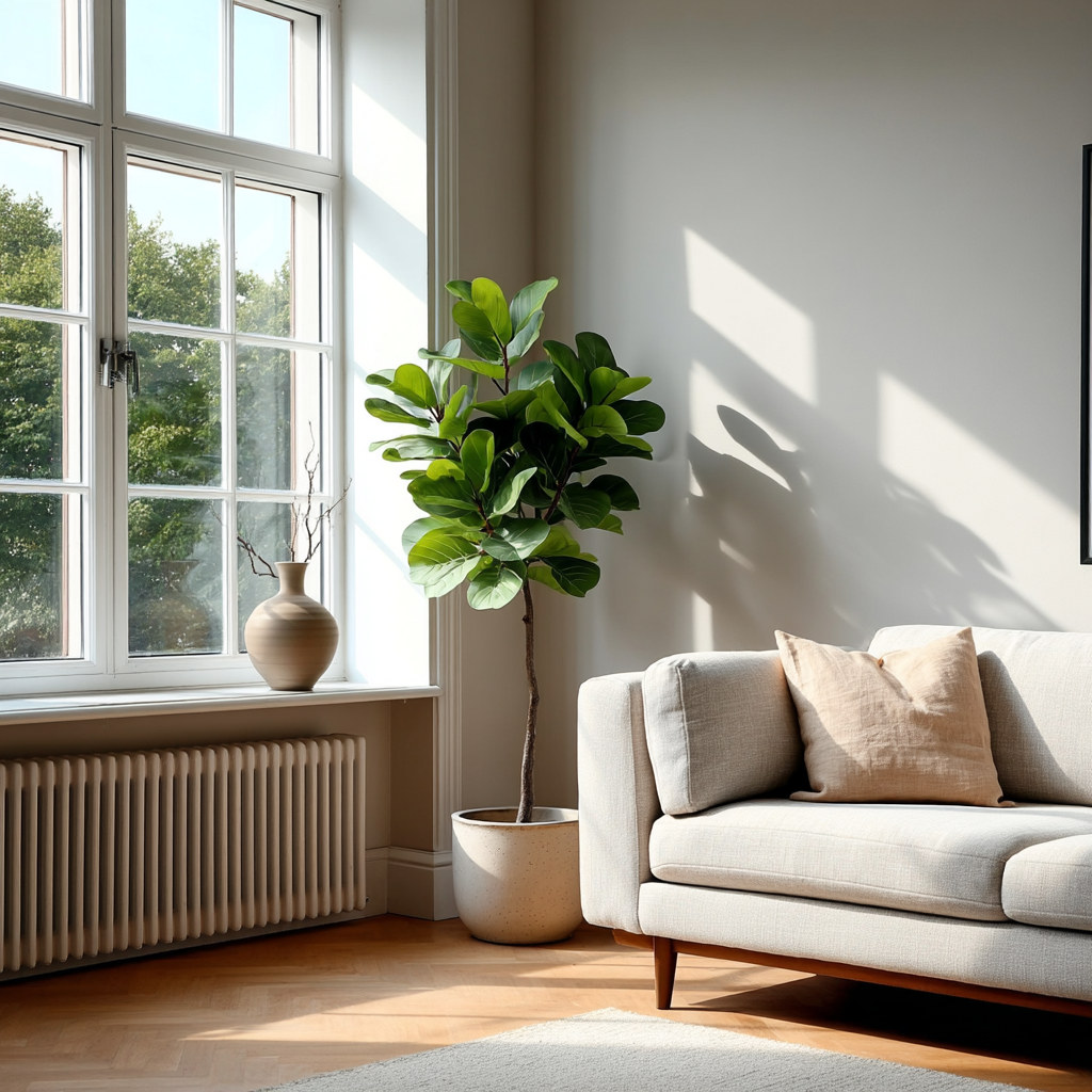 Fiolinfiken – naturtro tekstur og dybde i bladverket, ideell for nordisk interiør.