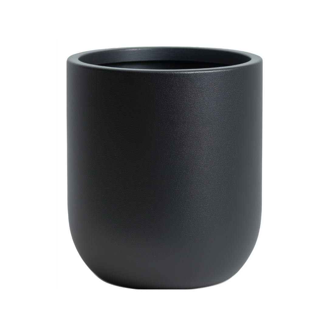 Elegant potte i dyp, matt sort med avrundet form som gir et moderne og tidløst uttrykk. Den mørke overflaten fremhever både grønne planter og blomstrende trær, og skaper en tydelig kontrast i lyse omgivelser.