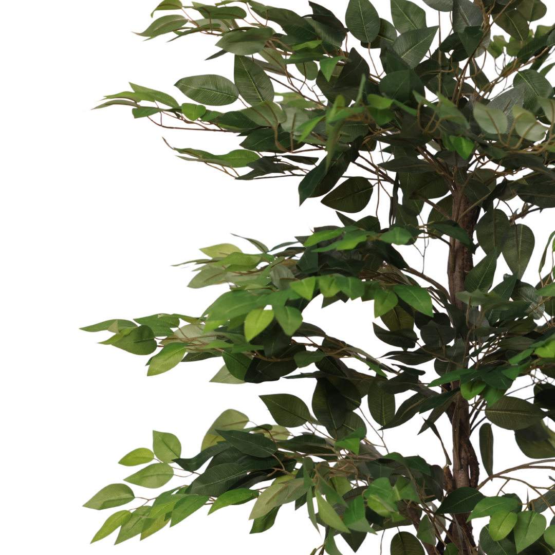 Fikus er en klassisk grønnplante med tett bladverk og flettet stamme som gir et naturtro uttrykk. De fyldige bladene gjør den ideell som dekorasjon i stue, entré eller kontor, hvor den tilfører grønn struktur uten behov for stell.